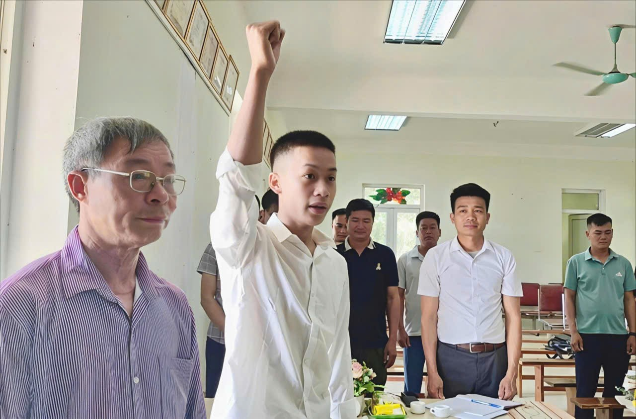 Các đồng chí lãnh đạo xã trao quyết định kết nạp đảng viên mới cho các tân binh