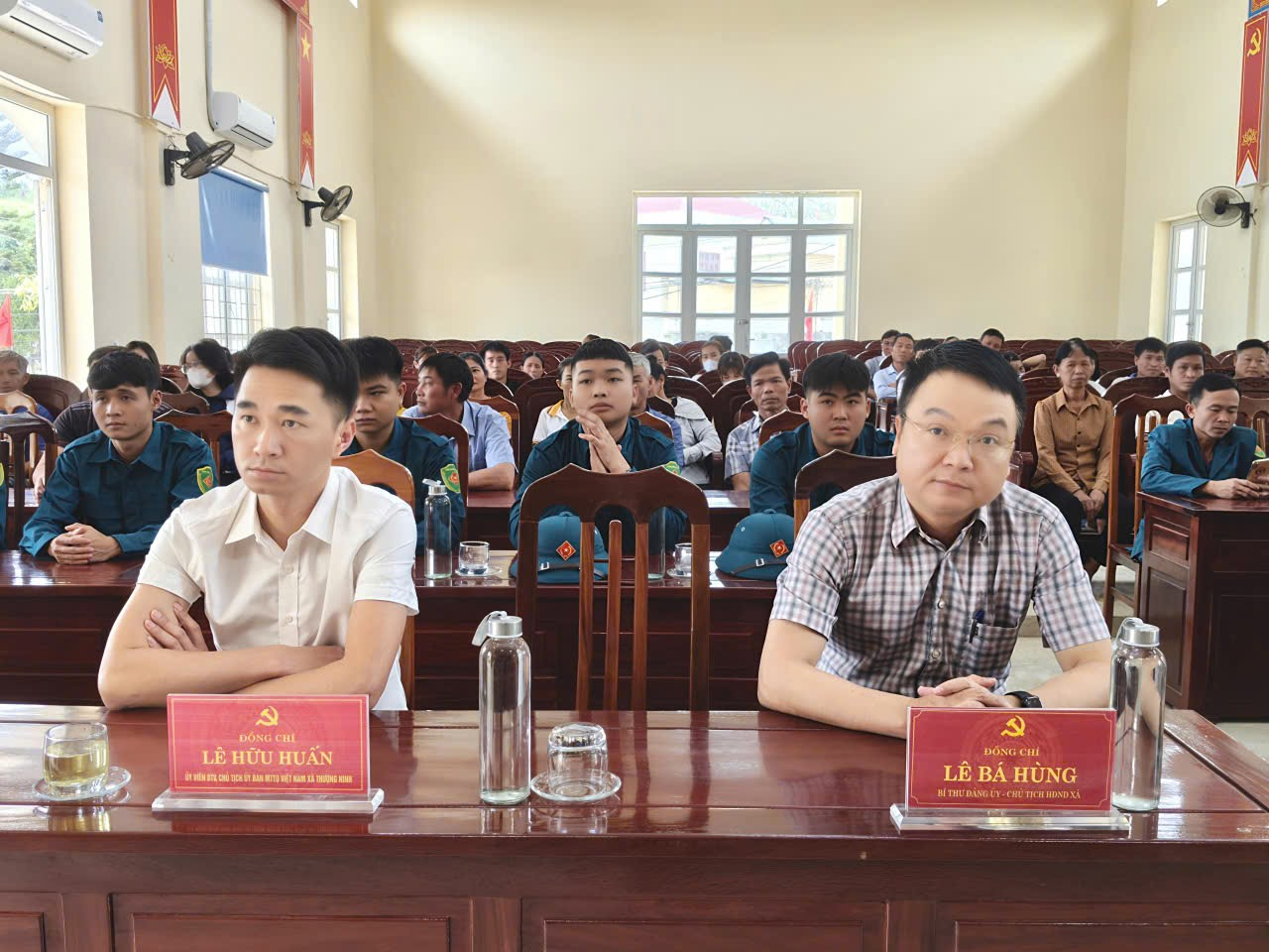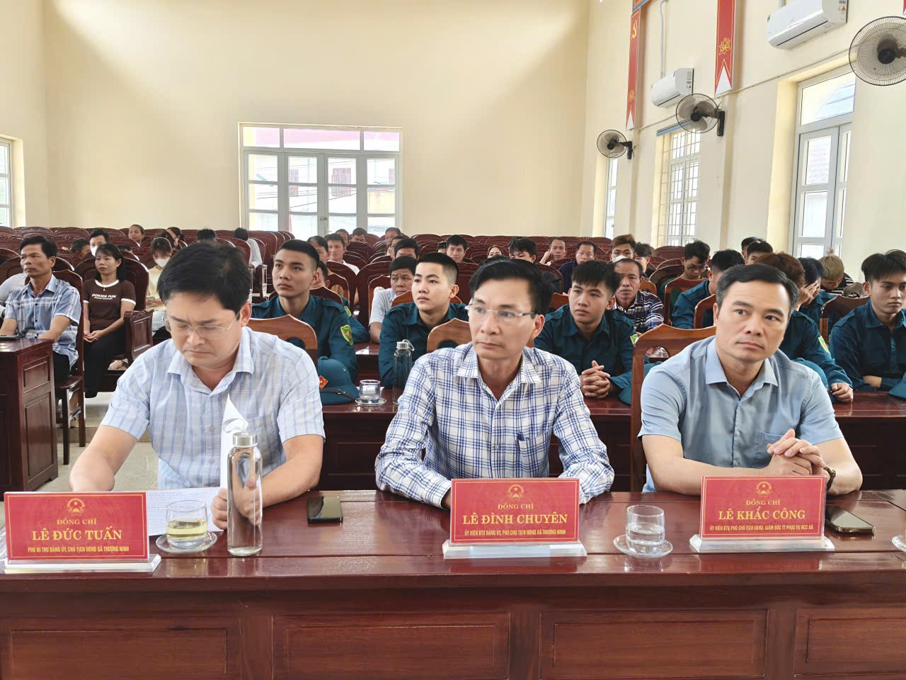 Tham dự hội nghị có đồng chí Lê Bá Hùng, Bí thư Đảng uỷ, Chủ tịch HĐND xã; Đồng chí Lê Đức Tuấn, Phó Bí thư, Chủ tịch UBND xã; các đồng chí lãnh đạo Thường trực HĐND, UBND xã; đại diện các ban, ngành, đoàn thể; trưởng thôn, thôn đội trưởng cùng toàn thể Tiểu đội Dân quân thường trực.