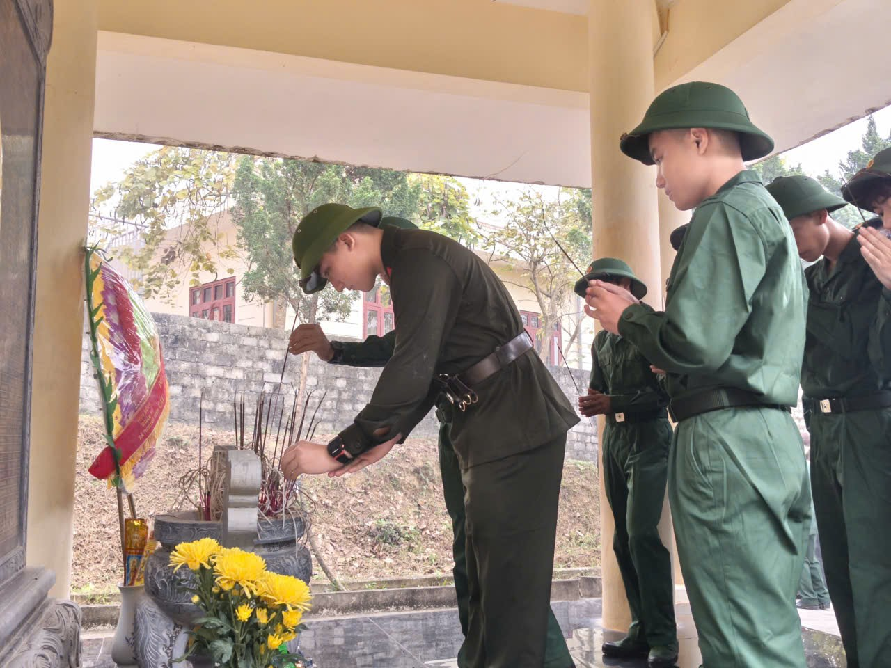 Các đồng chí lãnh đạo, tân binh dâng hương, dâng hoa tại nhà bia tưởng niệm các anh hùng liệt sĩ tại thôn Đồng Tâm