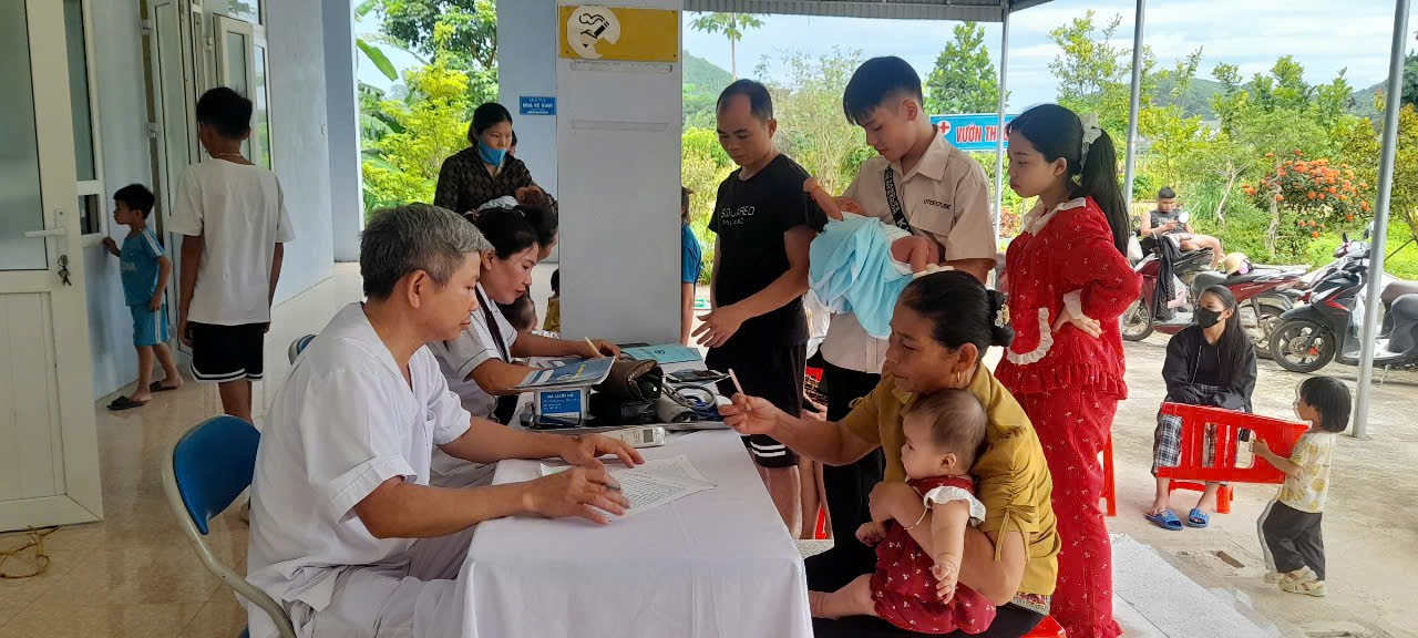 bộ y bác sĩ điểm trạm y tế Cát Tân thăm khám ban đầu cho trẻ