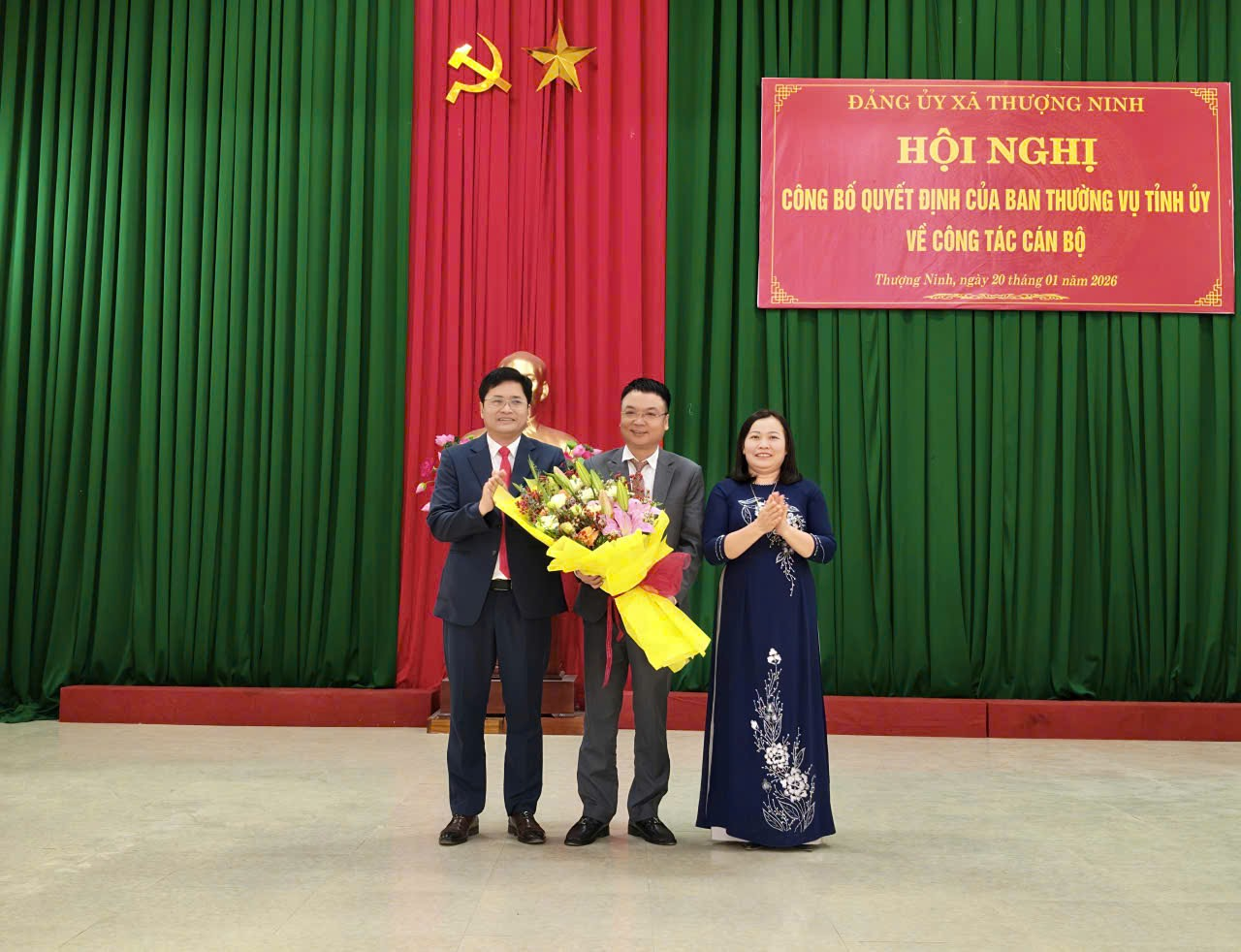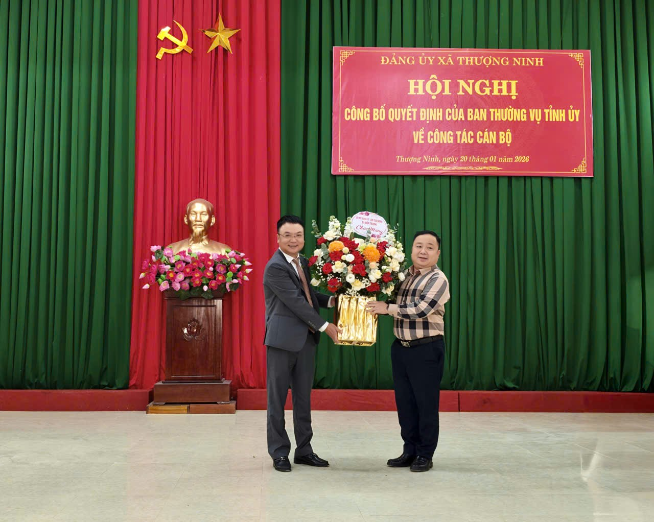Đồng chí Vi Thị Phượng, Phó Bí thư Thường trực Đảng ủy và đồng chí Lê Đức Tuấn, Phó Bí thư Đảng ủy, Chủ tịch UBND xã Thượng Ninh tặng hoa và chúc mừng đồng chí Lê Bá Hùng nhận nhiệm vụ Bí thư Đảng ủy xã Thượng Ninh