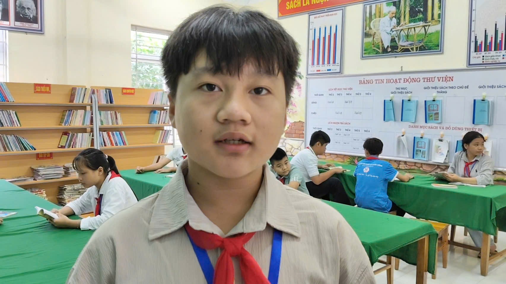 Em Nguyễn Thành Trung, học sinh lớp 7A chia sẻ “ Đến với thư viện xanh của nhà trường em có thể tìm hiểu nhiều được kiến thức bổ ích cho các môn học như toán học, văn, khoa học tự nhiên,… ngoài ra e còn tìm hiểu kiến thức về lịch sử của nước ta qua những cuốn truyện tranh… từ đó giúp em học tập ngày một tiến bộ hơn ”.